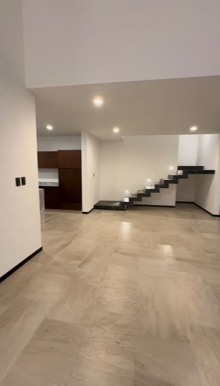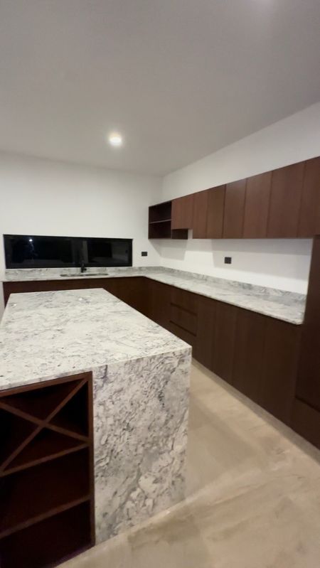 - Recubrimiento de marmol Monterrey en escaleras interiores, muros barra del wet-bar