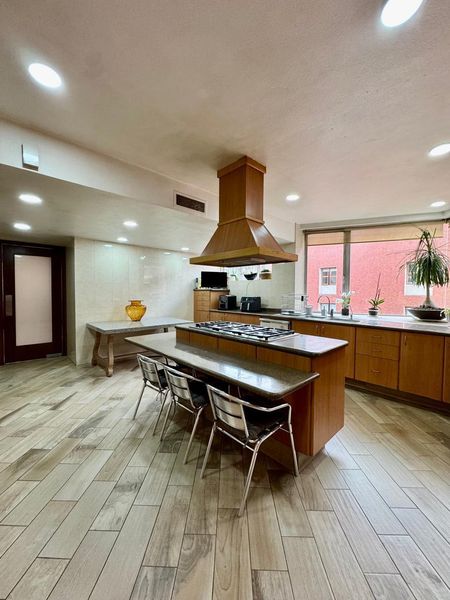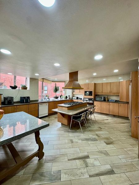 - Cocina integral de gran tamaño con alacena y espacio para desayunador, con acceso directo al comedor por puerta corrediza.