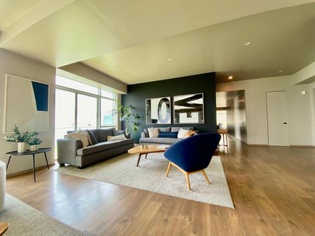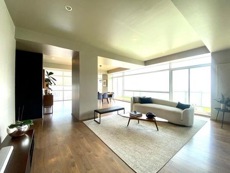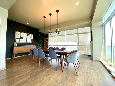 Sala y comedor gigantes con ventanal a lo largo y acceso a la terraza con vista espectacular a la CDMX.
