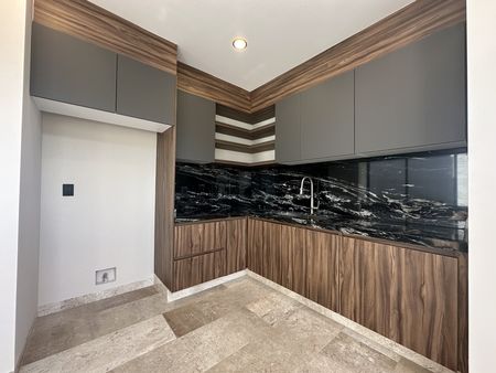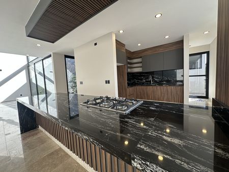 - Cocina equipada, barra y backsplash de mármol