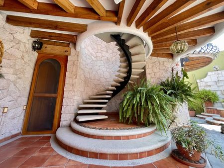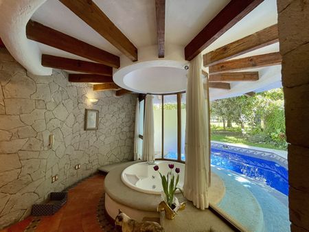 Amplio vestíbulo, principal, doble, sala, comedor, desayunador, cocina integral, medio baño de visitas, patio colonial con Fuente de cantera preciosa, rodeada de palmeras, recámaras, con baño completo, clóset y vestidor, una con tapanco, ventilación cruzada, iluminación natural y remates visuales verdes, Master suite, principal, con jacuzzi, acceso directo a la alberca, jardín, con asador pergolado, preciosa, vista al campo de golf, amplio, estudio con medio baño, Bodega, cuarto de servicio con baño completo, cuarto de lavado, terraza con vista al jardín y al campo de golf.