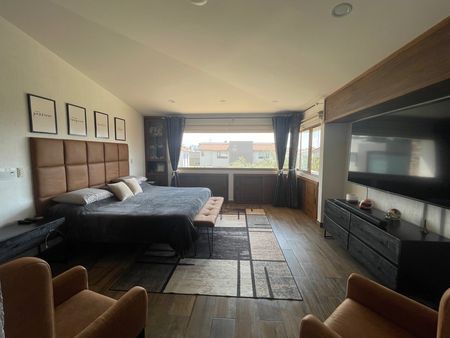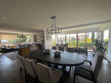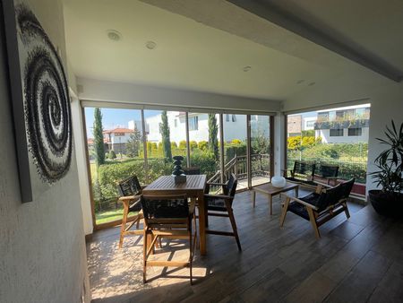 Moderna e iluminada casa en renta en Rincón de los Encinos, estancia acogedora con chimenea, amplio comedor, sala de estar con vista al jardín. Cocina integral espaciosa, con parrilla, horno de gas, doble tarja, lavavajillas e isla movible, estudio, medio baño y lavandería.