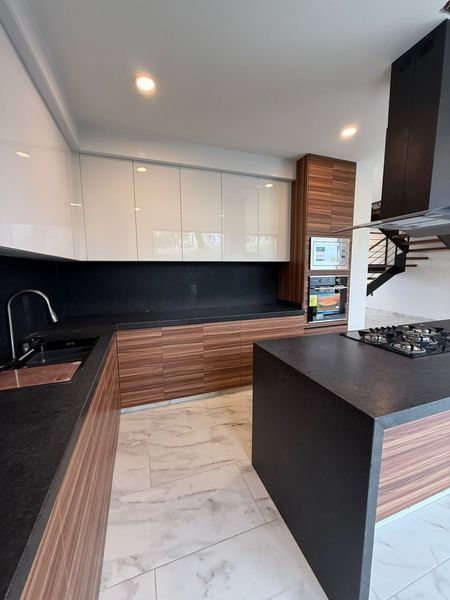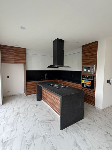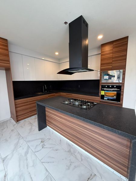 * COCINA CON TORRE DE HORNOS CON ISLA Y BARRAS DE GRANITO.