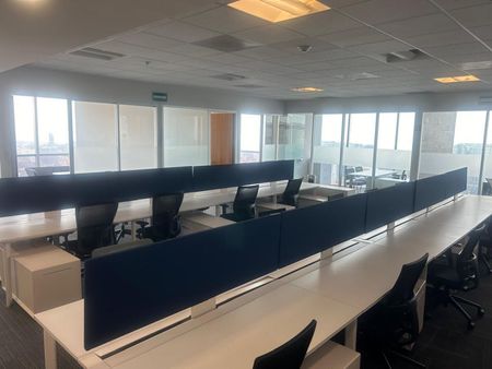 La oficina cuenta con recepción, varios privados, sala de juntas, área de site, área para alimentos, área de trabajo.