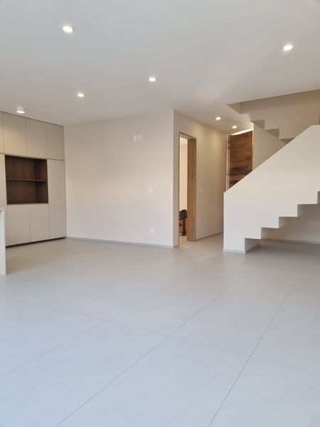 En planta baja cuenta con cochera para 2 autos, estudio o recámara, baño completo, amplia sala-comedor, cocina integral con barra de granito, cuarto de lavado y jardín trasero.