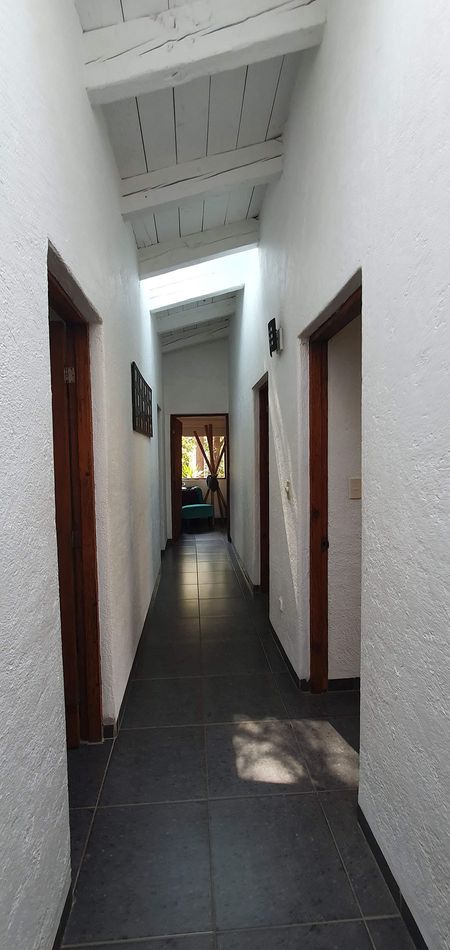 En un solo piso la casa principal tiene tres recámaras completas y la principal con un buen baño, tina y vista al área social a través de un gran ventanal y claro, su chimenea para darle calor de hogar vallesano total.
