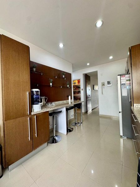 Cocina cerrada con barra, amplia alacena y espacio para desayunador.