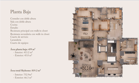 Exclusivo Pent House, 2 pisos, 3 recámaras con baño y clóset cada una, 1/2 baño de visitas, cuarto de servicio, terraza, totalmente equipado, 819.2 mts totales en dos plantas, excelente calidad de acabados, $ 84,639,000.00.