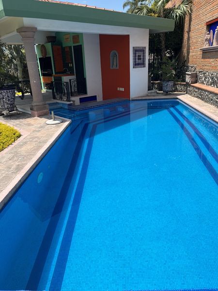 ALBERCA DE 10 MTS LARGO POR 4.5 ANCHO CON PROFUNDIDAD DESDE 1,20 A 1.50 CM; TIENE CALDERA DE GAS Y ESTA AÉREA, NO SUBTERRANA