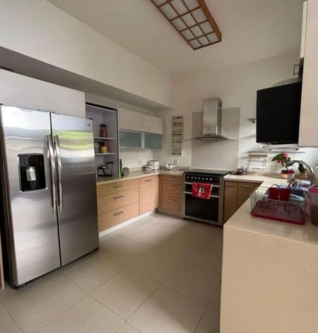 * Cocina integral con amplio desayunador, despensa y vista al jardín interior con asador y terraza
