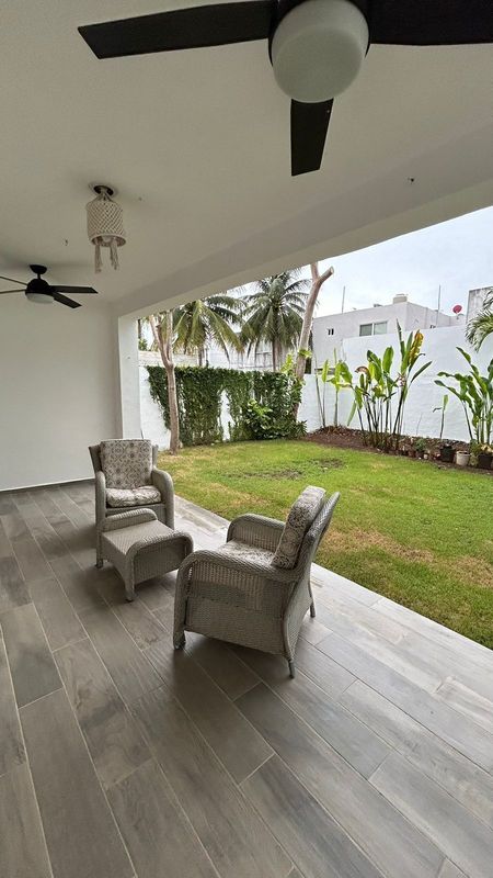 Terraza techada con piso cerámico imitación madera y dos ventiladores marca Hunter