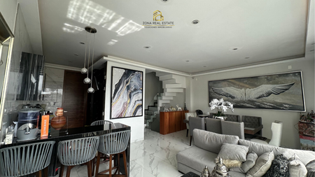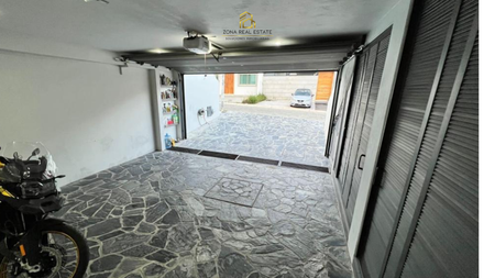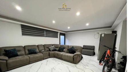Cochera para 2 autos, oficina, medio baño patio, área de tv o salón de juegos.