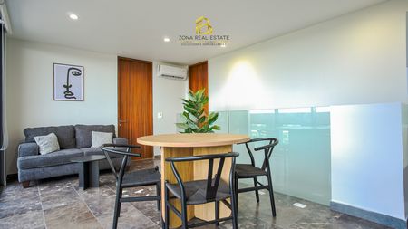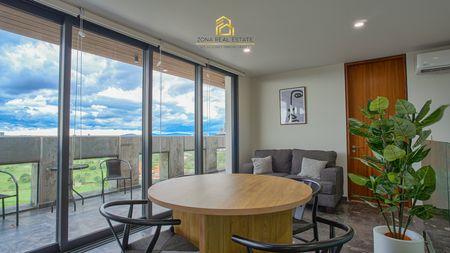 Cuenta con dos recámaras, dos baños completos, área de sala y comedor, cocina completamente equipada y una terraza de gran tamaño, ideal para disfrutar de la tranquilidad y las vistas únicas.