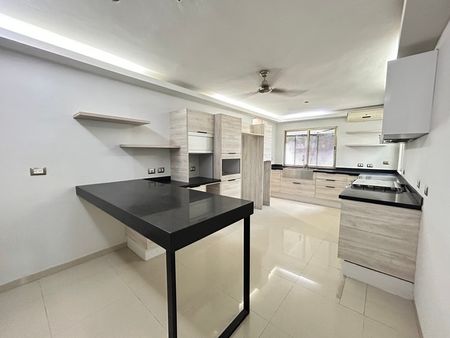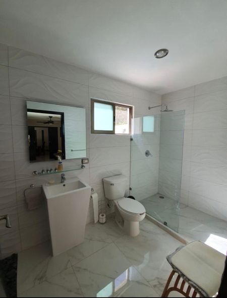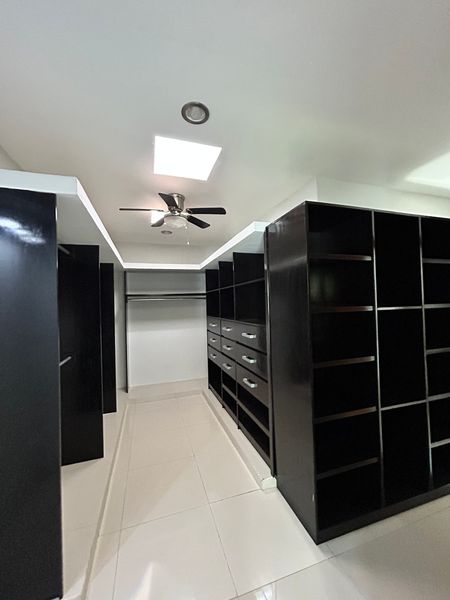 Planta Baja: Amplio espacio para estacionamiento con portón automatizado, cuarto de servicio con baño, área de lavado y tendedero, piscina, terraza, estudio, cocina, sala-comedor, y cuarto de TV con baño completo.