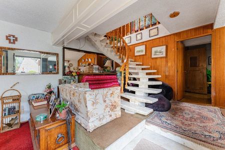 3. En primer piso se ubica estudio con tapanco y recámara con clóset, así como recámara principal con chimenea, vestidor y baño completo con tina de baño con hidromasaje, todo el primer piso alfombrado. (96 m2).