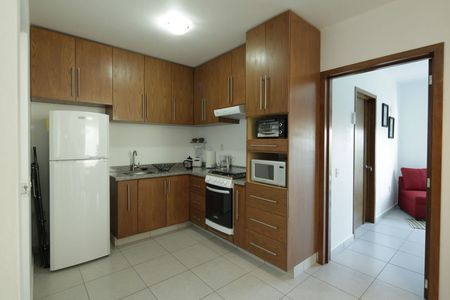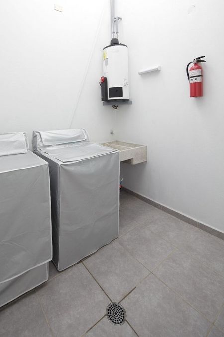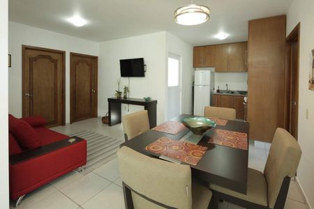 Una vez subiendo al primer piso, tenemos un hermoso departamento completamente amueblado que consta de una sala bien iluminada, comedor con TV, cocina integral equipada, 2 baños completos, 3 recámaras, cada una con su mini Split de 1 tonelada invertex. Los clósets y puertas son de madera caoba, acabados que le dan un estilo moderno y alegante. Tiene cuarto de servicio con centro de lavado incluido, así como boiler y gas estacionario. La electricidad es bifásica y el balcón también tiene barandal de acero inoxidable y vidrio templado.