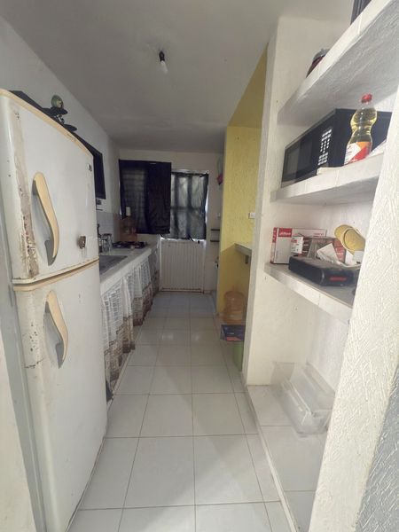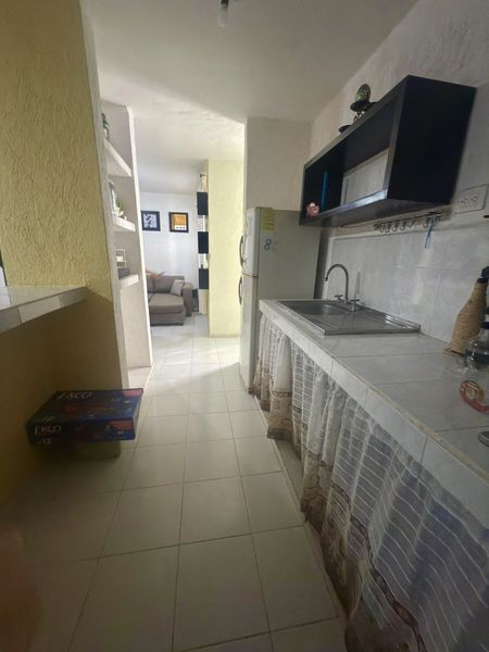 Cocina completa con barra desayunadora y espacio para alacena de pared