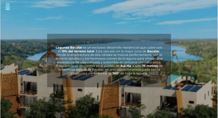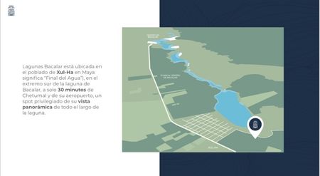 Lagunas Bacalar es un exclusivo desarrollo residencial que cubre solo el 19% del terreno total. Está ubicado en la mejor zona de Bacalar, donde la arquitectura de alta calidad se mezcla perfectamente con el entorno selvático y los hermosos colores de la laguna para ofrecer una experiencia de vida cómoda y sostenible en armonía con naturaleza. El desarrollo se encuentra en el pueblo de Xul-Ha, a solo 75 metros de la hermosa laguna de Bacalar, en una ubicación privilegiada con la mejor vista panorámica de 360° de toda la laguna..
