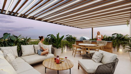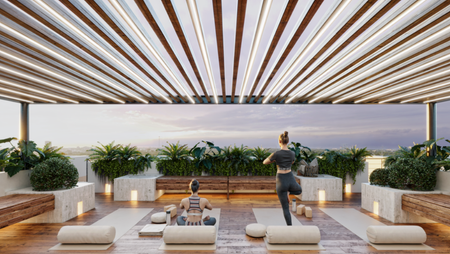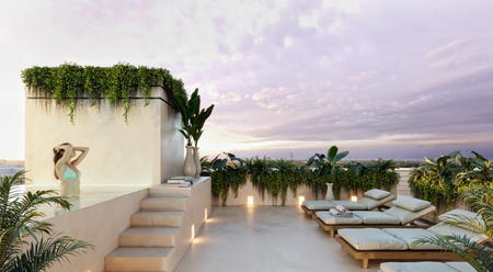 Roof Top con mobiliario, roof Top con alberca y camastros, terraza social, zona zen, green de golf,