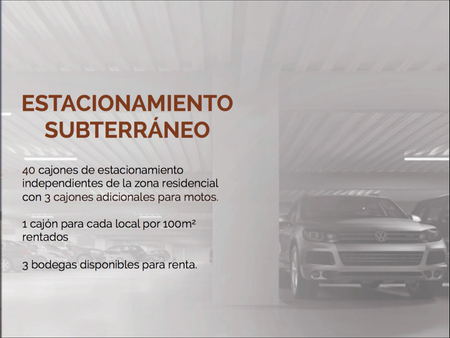 7 cajones de estacionamiento sobre avenida, así como 40 cajones de estacionamiento en subterráneo (espacio destinado únicamente para el área comercial. Ubicado frente del nuevo desarrollo San Patricio con 2 torres de departamentos de lujo.