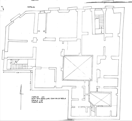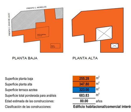 El edificio cuenta con una superficie en planta baja de 255.28 m2 de cons, 347.80 en planta alta y una terraza/azotea de 323 m2, dando una superficie total de 683.83