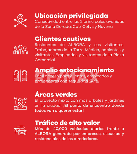 Plaza Albora ofrece locales comerciales con diseño moderno, excelente ubicación y alto flujo vehicular, ideales para giros como oficinas, cafeterías, restaurantes boutique, consultorios o servicios profesionales.