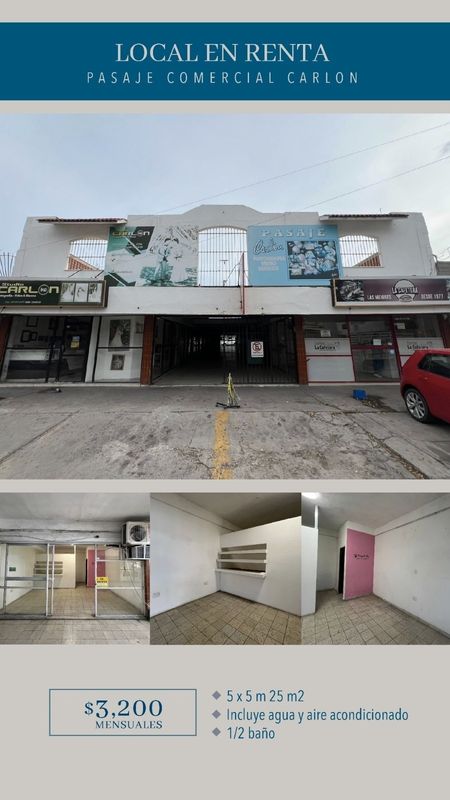 Local en renta pasaje comercial Carlon col. Centro - 5 x 5 m 25 m2 - $3,200 mensual - incluye agua y aire acondicionado - 1/2 baño