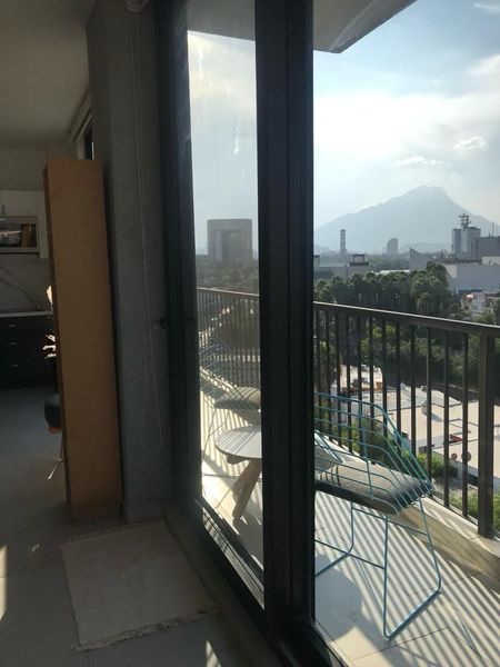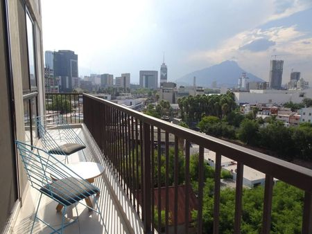 Hermoso y funcional loft listo para habitar, amueblado, con cocina de lujo, piedra tecnológica, parrilla y boiler eléctrico, con persianas, black out de techo a piso. En el corazón de Mty. Cerca de la Macroplaza, parque fundidora y museos. Con vistas panorámicas de Mty.