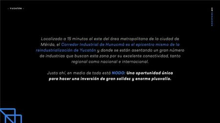 Localizado a 15 minutos al este del área metropolitana de la ciudad de Mérida, en el corredor industrial de Hunucmá, epicentro de la reindustrialización de Yucatán y donde se están asentando un gran número de industrias que buscan esta zona por su excelente conectividad, tanto regional como nacional e internacional.