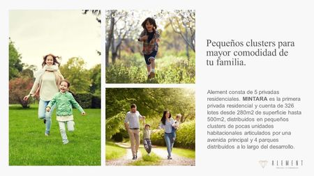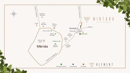 MINTARA es la primera privada residencial y cuenta de 326 lotes desde 343m2 de superficie hasta 500m2, distribuidos en pequeños clusters de pocas unidades habitacionales articulados por una avenida principal y 4 parques distribuidos a lo largo del desarrollo y pertenece al desarrollo residencial Element que consta de 5 privadas residenciales en una de las zonas con mayor plusvalía de Mérida Conkal.