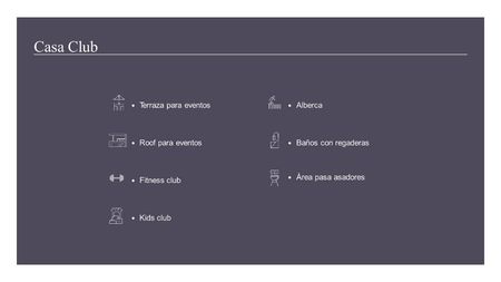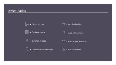 Barda perimetral, vigilancia y control de acceso 24/7,cancha de padel, cancha de uso múltiples, área administrativa, amplios jardines, parque de mascotas, parque wellness, terraza para eventos, roof para eventos, fitness club, kids club, alberca, baño con regaderas y áreas de asadores .