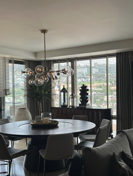 - Cocina: Abierta, con acabados en granito y madera de nogal, herrajes de metal y luminarias colgantes decorativas de la prestigiada firma Funart