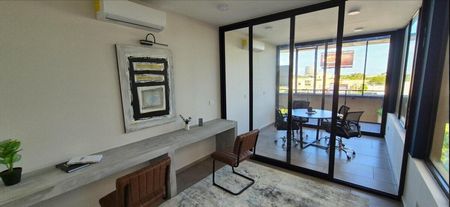 -Fijo de cristal templado en baños, parrilla eléctrica, meseta de granito en cocina, mármol en baños, closets semi-vestidos, gavetas inferiores en cocina.