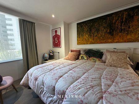 El departamento tiene una superficie construida de 400 m² e incluye tres recámaras, cada una con baño y vestidor. También cuenta con un medio baño adicional, área de servicio y cuarto de lavado. Las áreas comunes incluyen una cocina totalmente equipada, una sala de estar/televisión, un comedor y una oficina.