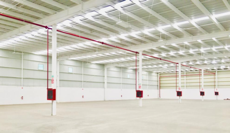Fachada corporativa, sistema contra incendio (gabinetes y mangueras) piso interior de concreto reforzado con fibra y espacio abierto de oficina.