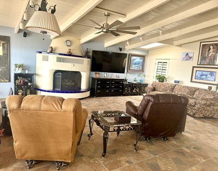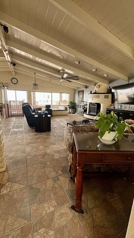 Spacious living room with a cozy fireplace