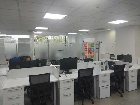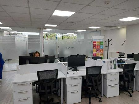 área abierta para 40 estaciones de trabajo cableadas con luz y datos , cabina telefónica, 6 privados, sala de juntas con pantallas, con capacidad de 6 a 10 personas y cuenta con archivero y cafetería,