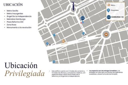 Edificio de Oficinas cuenta con dos niveles de comercio y nueve niveles destinados a oficinas y consultorios médicos, con espectaculares vistas hacia Paseo de la Reforma y el Ángel de la Independencia.