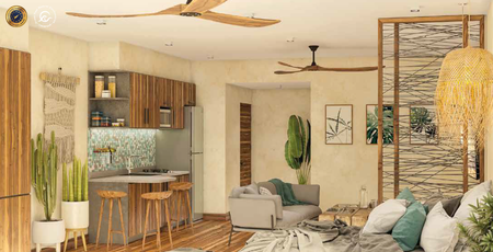 Complejo de estudios en Playa del Carmen. El edificio está construido en estilo natural y moderno eco-chic. Nuestro complejo se componede 23 estudios completamente equipados y amueblados desde 40 m² hasta 52 m² en preventa y es perfecto para renta vacacional.