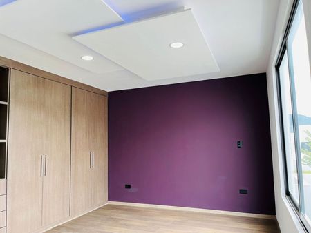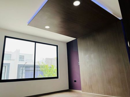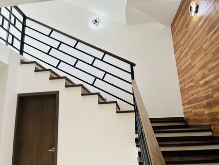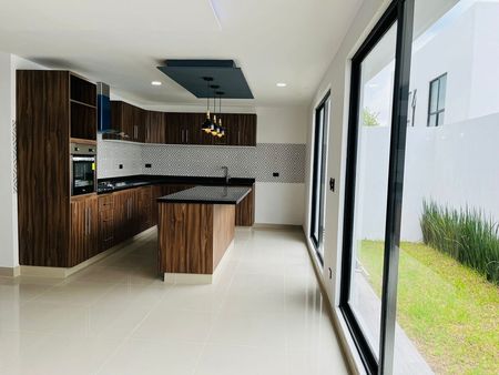 Cochera p/2 autos, recibidor con triple altura, amplia sala y comedor, cocina equipada con barra de granito, ½ baño de visitas, jardín.