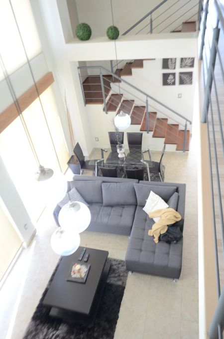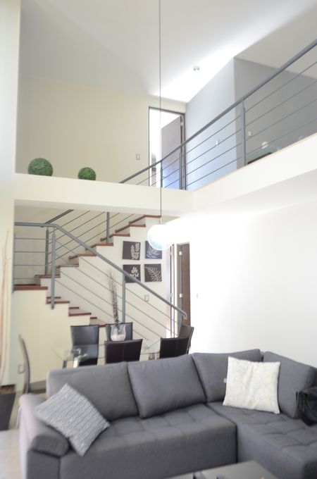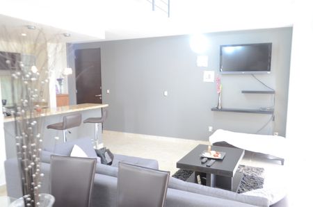 Sala a doble altura, cocina equipada y con barra desayunador, gran recamara con balcón, vestidor, closet y baño.