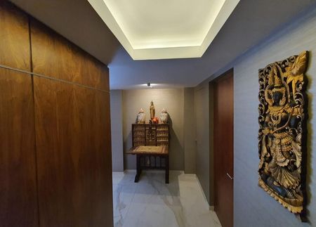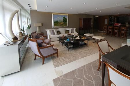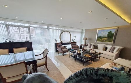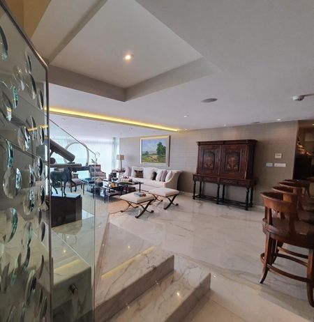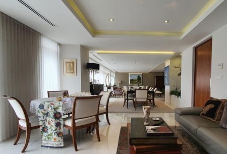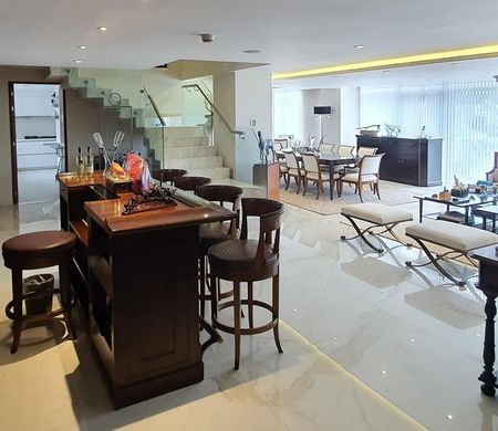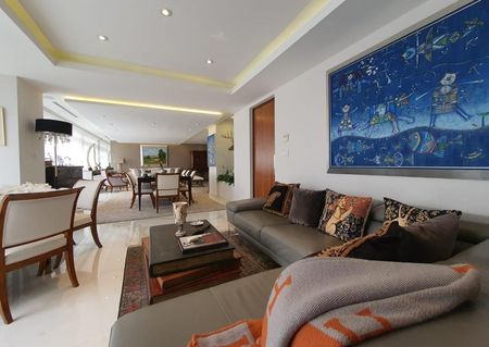 comedor, sala de estar, biblioteca y antecomedor muy iluminada. La cocina integral y equipada con finos acabados (quetzal). Cuarto de servicio y lavandería. Todo el departamento cuenta con aire acondicionado y calefacción central . Cuarto para choferes.