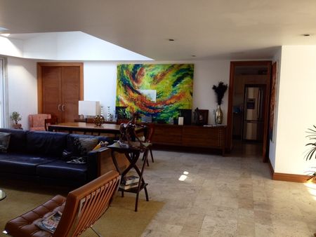 Distribuido en tres niveles, excelente iluminación, amplios espacios, tres recamaras, dos recamaras con vestidor, la principal con baño completo, vestidor, sala, comedor, 86 m2 roff garden, jacuzzi, , bodega, tres lugares de estacionamiento, vigilancia. Espectacular terraza y vista al Bosque.
