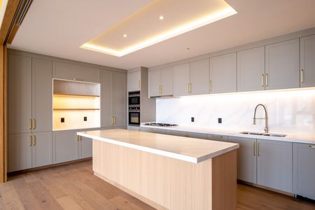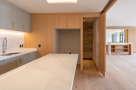 La cocina abierta es uno de los espacios más atractivos, equipada con cubiertas de cuarzo blanco y gabinetes en color gris, además de una alacena independiente.