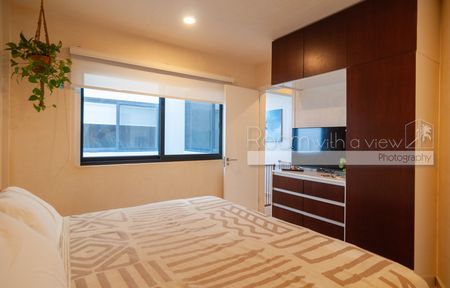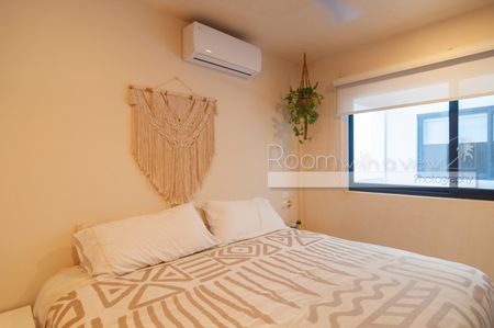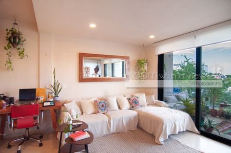 En su interior, el departamento presenta un diseño abierto y luminoso con acabados modernos, cocina completamente equipada y espacios acogedores. Se extiende hacia una amplia terraza techada con vista a la ciudad, ideal para disfrutar del café por la mañana o cócteles al atardecer. Los residentes y huéspedes también disfrutan de acceso al rooftop, que cuenta con alberca común, área de camastros y zona de asador al aire libre. El edificio ofrece acceso controlado y seguridad las 24 horas para su tranquilidad.