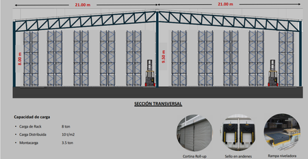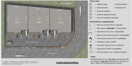 Este espacio contará con andenes de carga 6 posiciones, 30 estacionamientos, cuarto de maquinas, doble caseta de vigilancia y acceso, área de motocicletas. Construido con muros Tilt Up, pisos Joint-Less, altura libre de 8 a 9.5 m, distancia entre columnas de 21 m, cisterna, iluminación natural de 12 horas, energía base de 150 kVA (escalable), altura de andenes de 1.2 m, capacidad de carga de rack de 8 toneladas, carga distribuida de 10 toneladas por m2, montacarga de 3.5 toneladas, cortinas roll up, sellos de andenes, rampa niveladora.