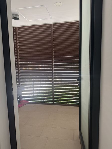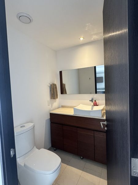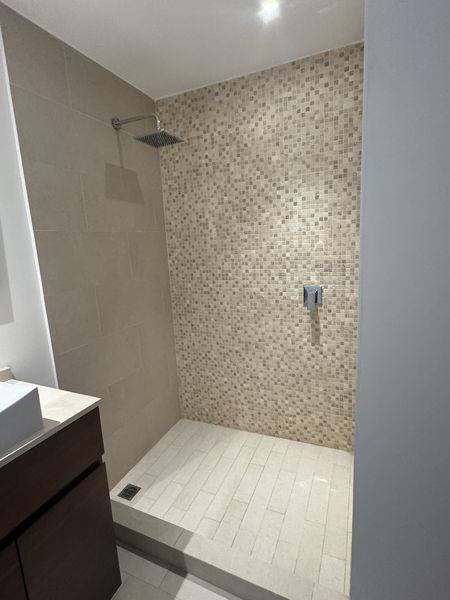 -Baño completo con cancelería de vidrio templado y acabados contemporáneos.