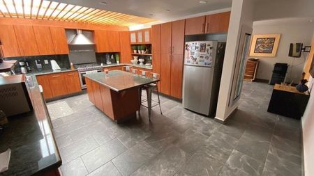 El vestíbulo tiene triple altura. La cocina amplia y equipada, cuenta con desayunador. Tiene un hermoso jardín y garage para 6 autos. Dos de ellos techados.