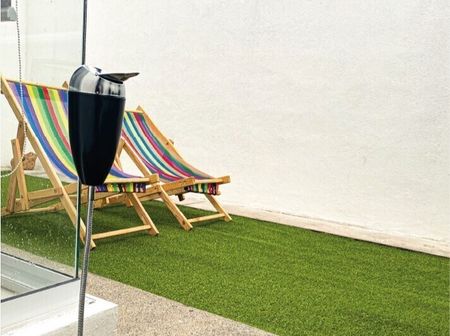 - Patio trasero con pasto sintético y asador.