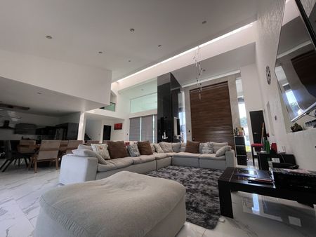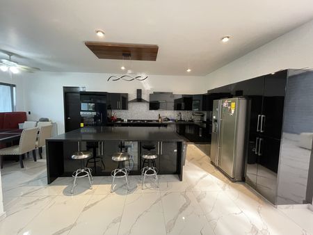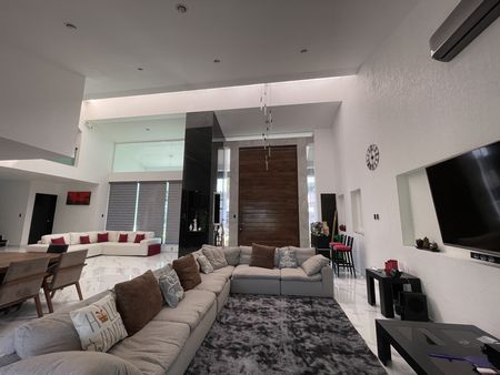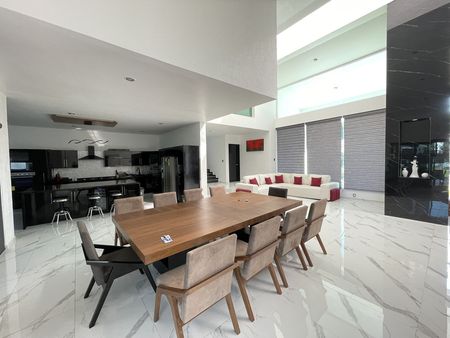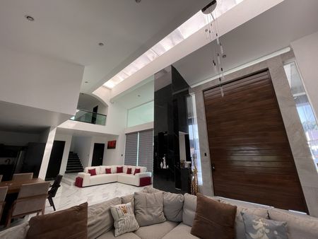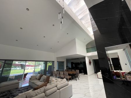 Este gran vestíbulo tipo mono espacio, tiene un techo abovedado con tragaluz que permite una luz cálida todo el día y cómoda iluminación natural por la noche y te permite disfrutar doble Sala: un family room, más sala de TV, comedor, cocina integral y desayunador con una gran isla de trabajo, barra de Onix, con un remate visual espectacular de su amplio jardín, además de estar comunicado a su amplia terraza, alberca y jacuzzi.